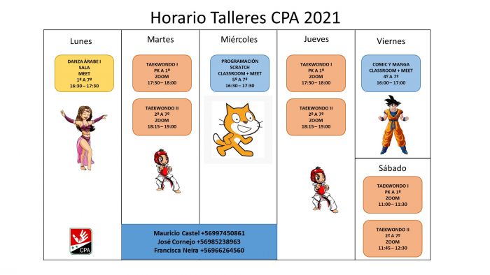 Estimados apoderados bienvenidos a la página informativa de los talleres CPA 2021. En esta página iremos informando respecto de la oferta de talleres que tendremos para este año, los valores, cupos y niveles a los cuales se impartirán. Nuestra idea es que conozcan cada uno de ellos y tengan una decisión clara al momento de postular.